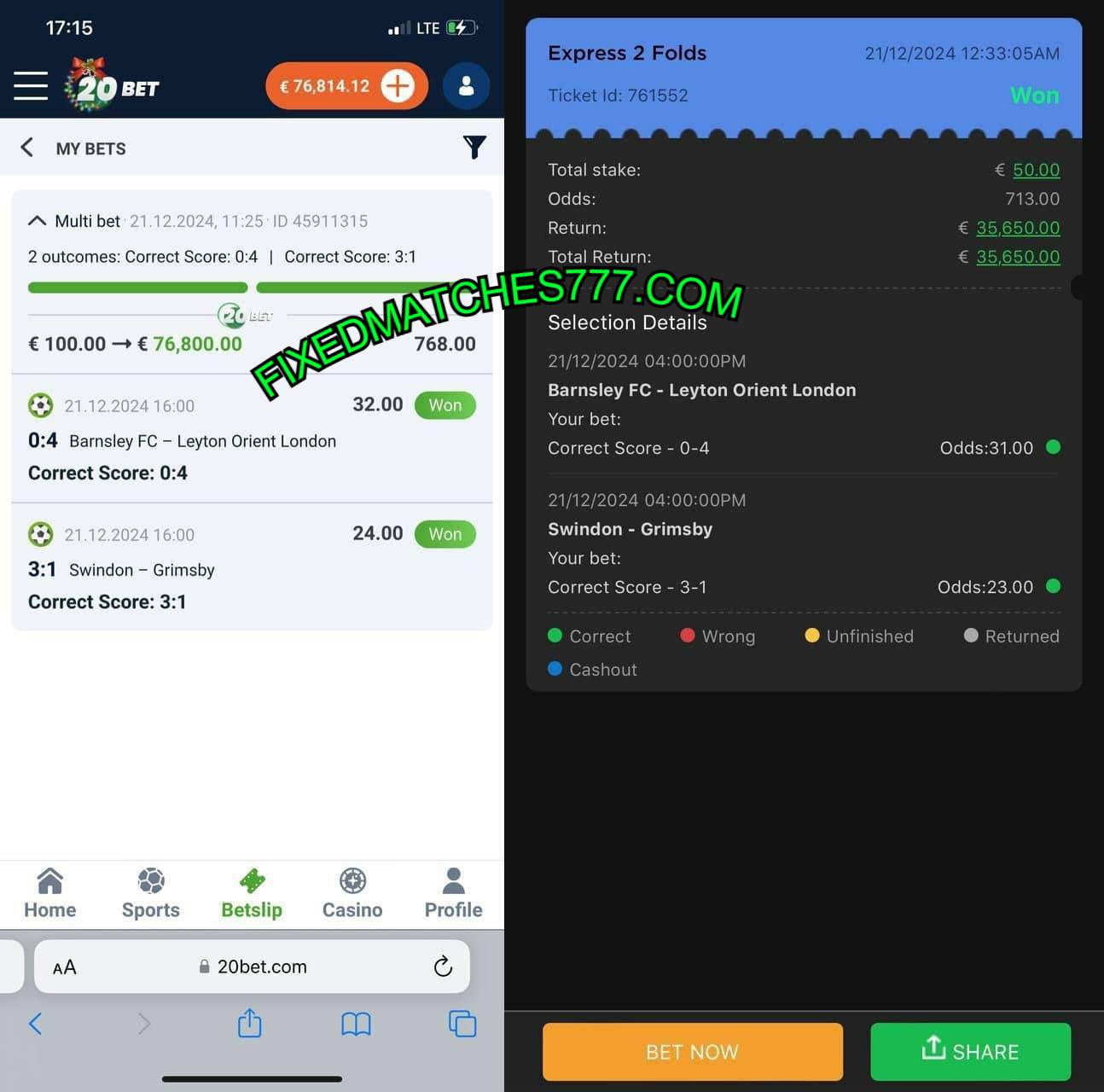 | Barnsley vs Leyton Orient | 0:4 (CS) | 34.00 | FT: 0:4 WIN |