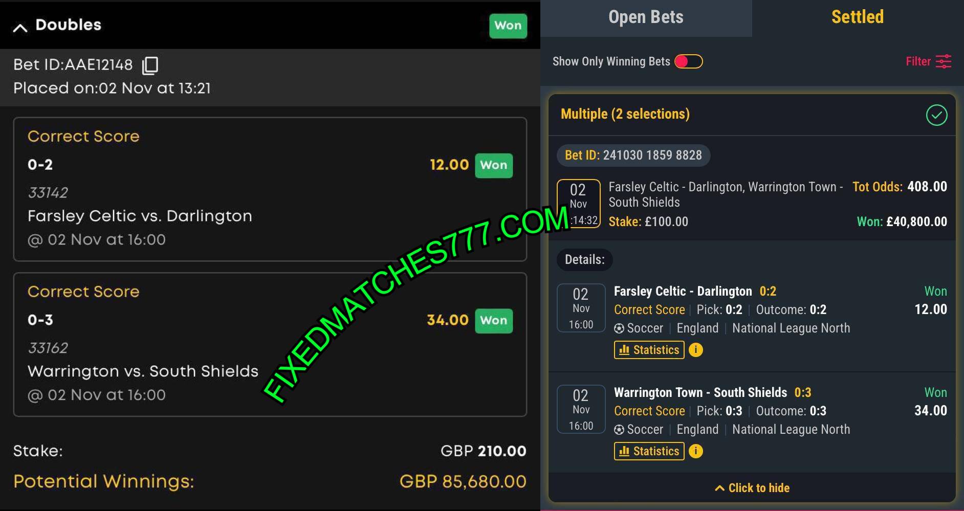 | Warrington vs South Shields | 0:3 (CS) | 34.00 | FT: 0:3 WIN |