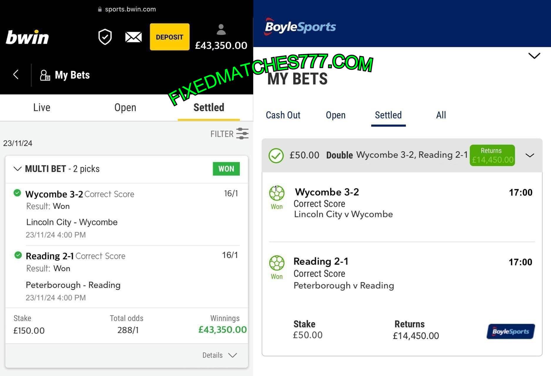 | Peterborough vs Reading | 1:2 (CS) | 17.00 | FT: 2:3 WIN |